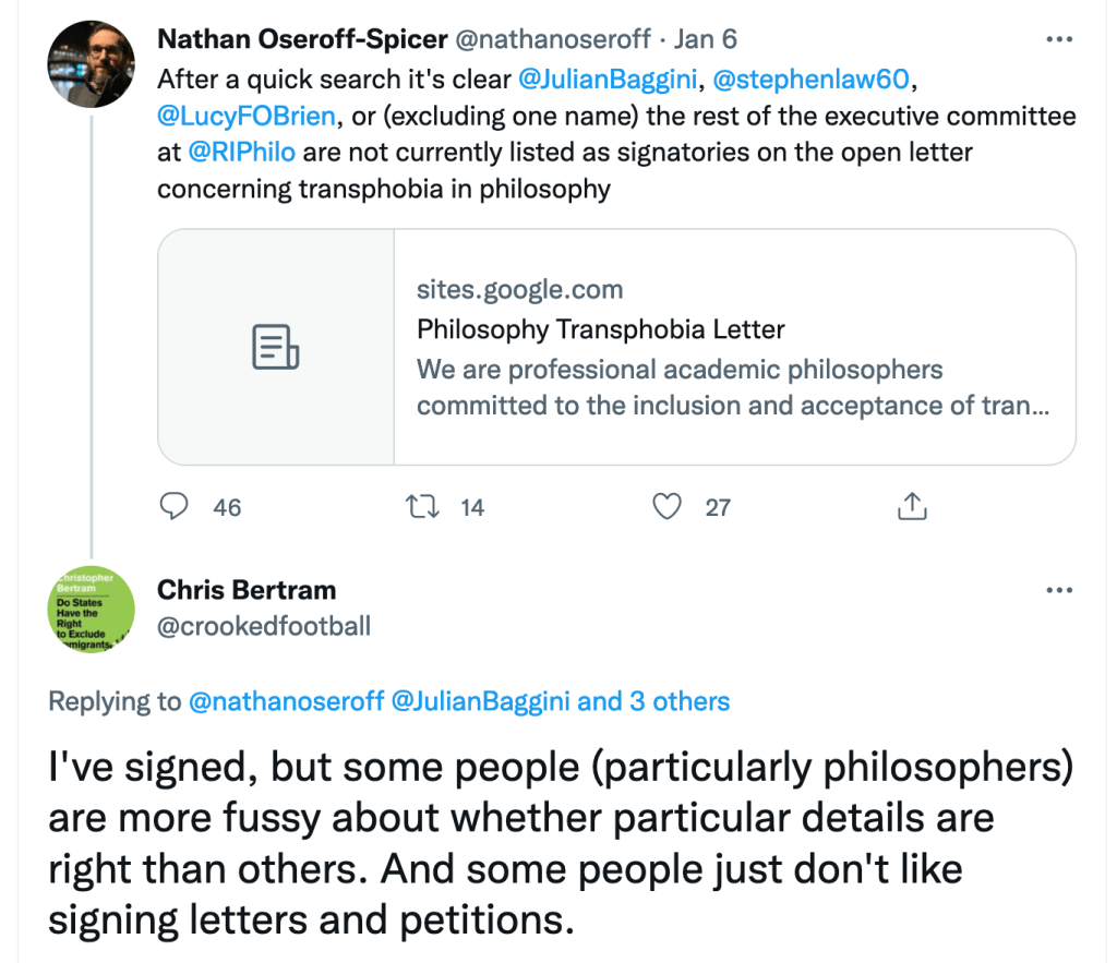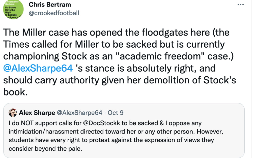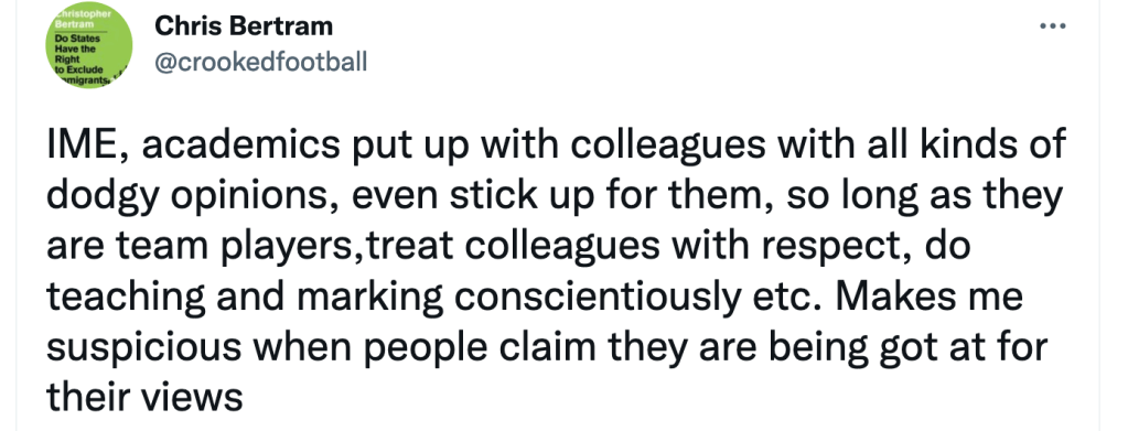 I also noted that Chris Bertram signed a public letter criticizing a British government award to Kathleen Stock, and did not sign another public letter in support of academic freedom, and Stock, at Sussex University, where Stock was formerly employed. These letters were signed by academic philosophers, which apparently was Bertram’s old job.