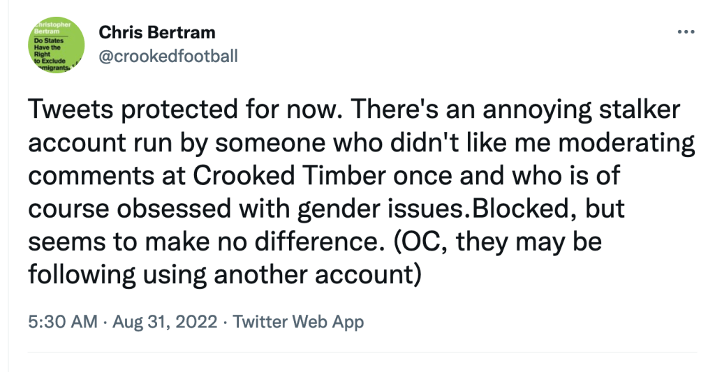 And, I am not that poor soul “obsessed with gender issues”: while I do tweet in some threads of his concerning trans issues, this is partly because there’s little else that he tweets that engages me, and partly because he banned me from commenting on crookedtimber after I answered some questions about his views on trans issues, by linking to his public statements. So that’s different too.